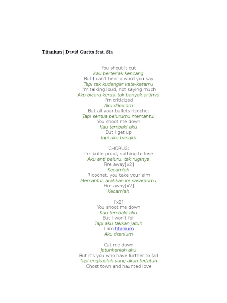 Titanium merupakan lagu dari album Nothing But the Beat 2011 yang dirilis pada 26 Agustus 2011. I am titanium Sia Cut me down But its you wholl have further to fall Ghost town and haunted love Raise your voice sticks and stones may break my bones Im talking loud not saying much Chorus Im bulletproof nothing to lose Fire away fire away Ricochet you take your aim Fire away fire away You shoot me down but I wont fall I am titanium. But I cant hear a word you say.